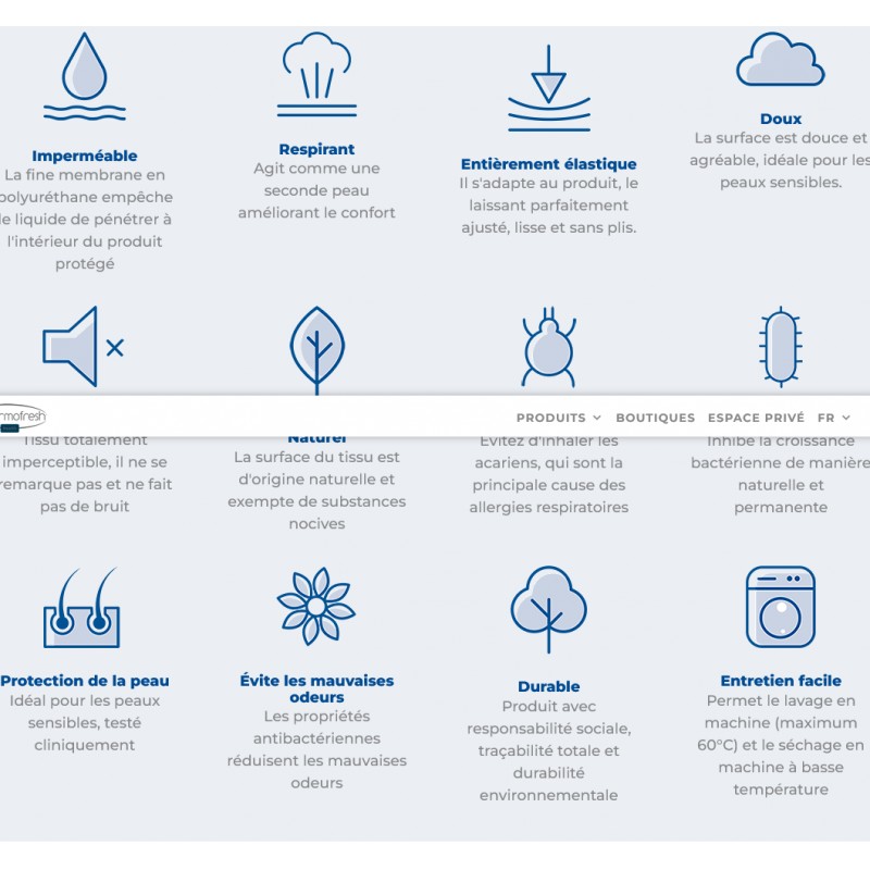 Hypoallergénique.Imperméable et respirant. Tests non feu : BS7175 up to CRIB 7. EN597. ISO12952. IMO Part 9. Lavable en machine à haute température. Passe au sèche-linge.