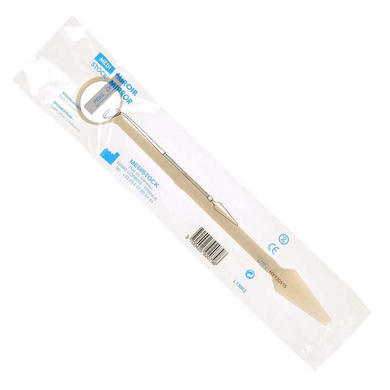 Miroir dentaire non stérile à usage unique, bénéficiant d’une excellente préhension grâce à son manche ergonomique qui permet une prise en main fiable, même pour le chirurgien équipé de gants stériles ou non.
