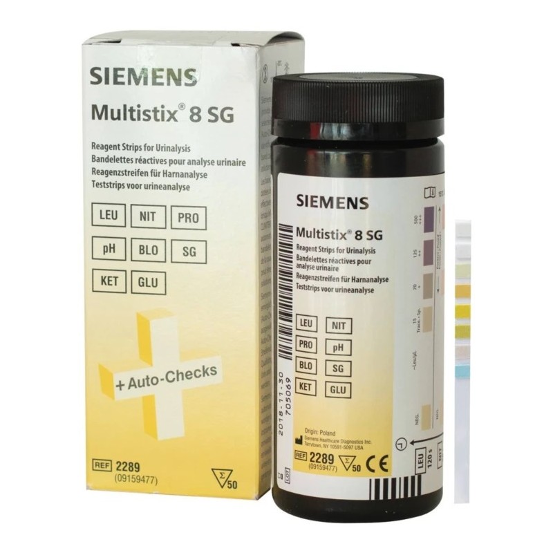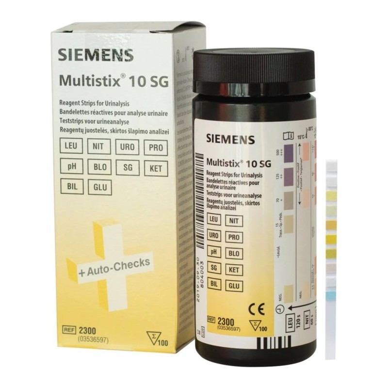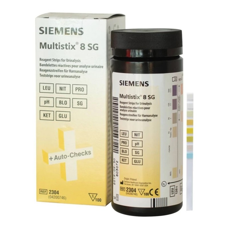 Les bandelettes Multistix® 8 SG aident au diagnostic et à la surveillance de pathologies les plus fréquentes comme les brûlures mictionnelles, les coliques néphrétiques, le diabète, les infections urinaires, la fièvre, la surveillance du lithiasique, la surveillance de la femme enceinte, l’hématurie, la protéinurie, les troubles métaboliques, etc. Les bandelettes Multistix® 8 SG permettent la détermination de 8 paramètres permettant d’orienter rapidement le diagnostic du médecin en première intention : glucose, corps cétoniques, SG (densité), sang, PH, protéine, nitrite et leucocytes.